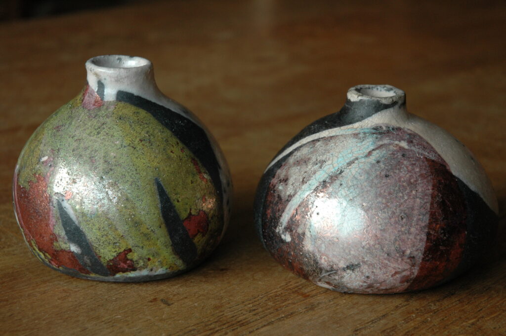 Le Raku est une technique très spéciale et spectaculaire dont l’origine se trouve dans la cérémonie du thé au Japon. La cuisson des pièces se fait à l’extérieur à une température de 1000°C; à la sortie du four elles sont soumises à un choc thermique et placées dans un tonneau rempli de matériaux combustibles. Ce tonneau qu’on couvre entraîne le manque d’oxygène, étouffe les flammes et fixe l’émail. L’effet craquelé typique apparaît alors. Aux endroit où il n’y a pas d’émail, l’argile est enfumée et sa couleur varie du gris au noir. Après une demi-heure on sort les objets du tonneau, on enlève la suie et on voit le résultat final.